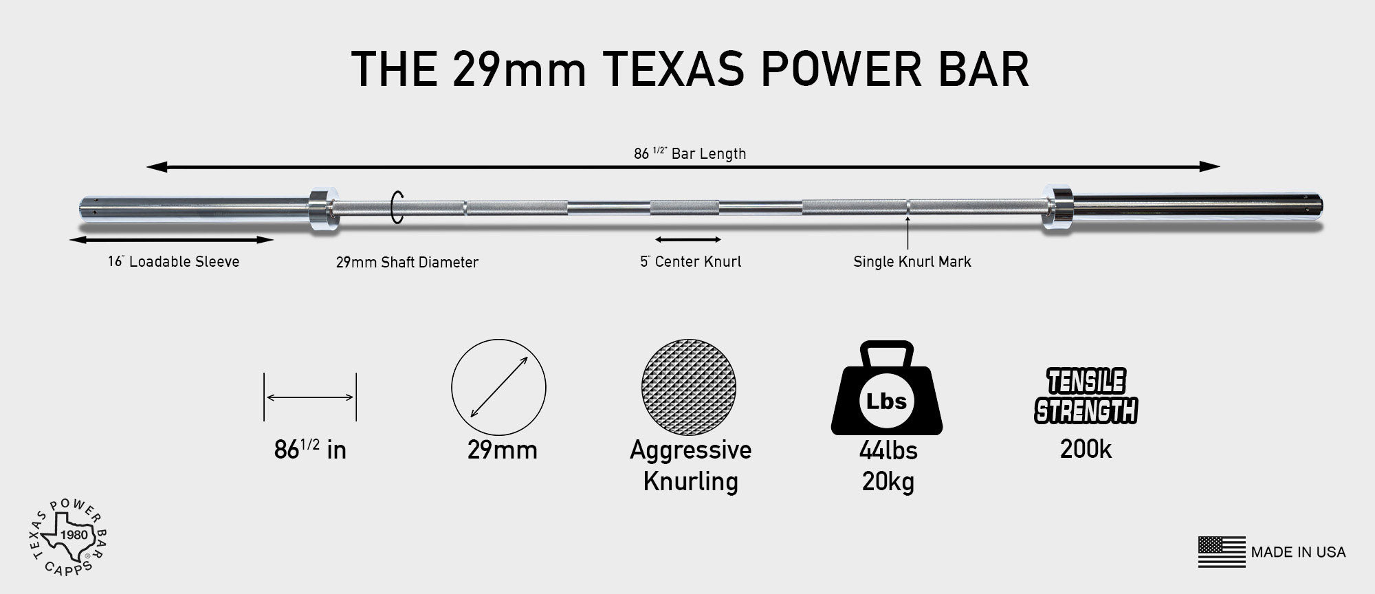The latest and greatest generation of the Texas Power Bar — built with the same aggressive knurling and unmatched durability that made the Original the most iconic powerlifting bar in history, now upgraded to a 29mm 200k tensile strength steel and re-engineered to meet modern USPA and IPL competition specs. Handbuilt in Texas from our stiffest 44 lbs / 20 kg, 29mm diameter shaft to date and featuring smooth, maintenance-free bronze bushings, thinner collars, a 5" center knurl for increased squat stability, 16" loadable sleeves, single knurl marks, and measuring 86.5" in length. Backed by industry-leading warranties and proudly carrying the founder and former powerlifter Buddy Capps’ legendary stamp of approval. If the Original Texas Power Bar has been your bar of choice for years, this 29mm 200k tensile strength upgrade is a no-brainer. *USPA & IPL APPROVED