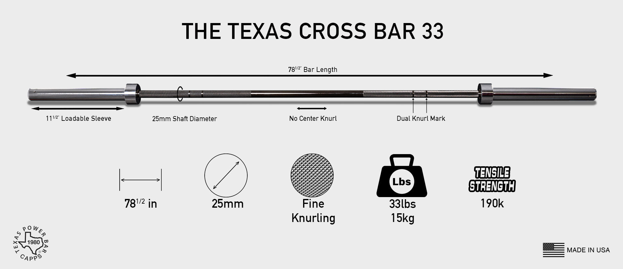 Texas Power Bars are known for their aggressive, long-lasting knurling. With regular use and proper care, the knurling will maintain its bite for decades.